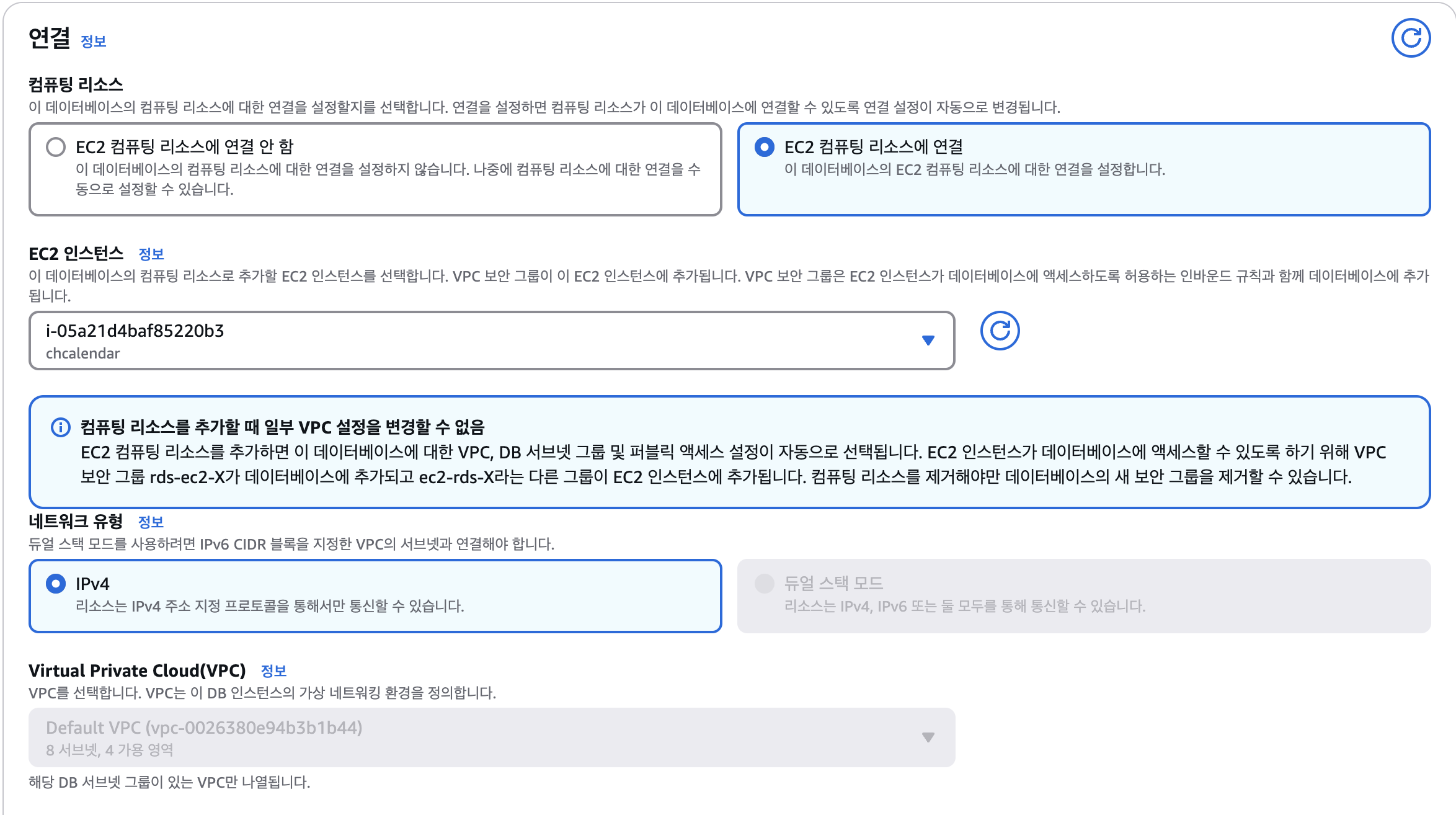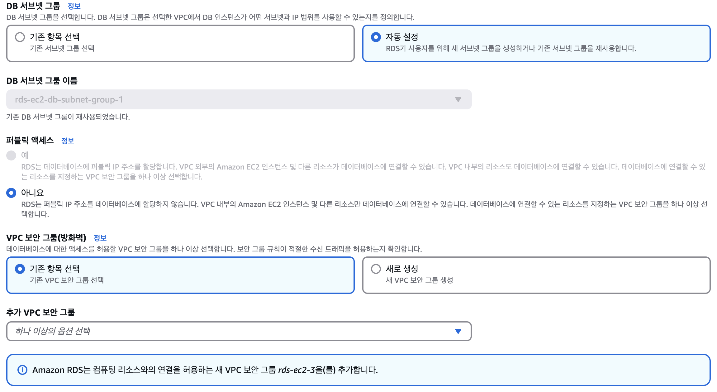 - 보안 그룹: RDS 생성 시 EC2 인스턴스와의 통신이 가능하도록 보안 그룹이 자동으로 설정됩니다.