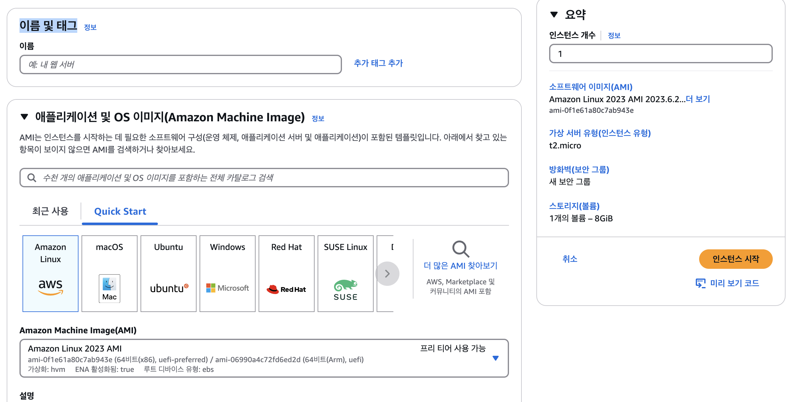- 애플리케이션 및 OS 이미지: 프리 티어를 기준으로 x86을 선택했습니다. 저는 Amazon Linux를 사용했지만, Ubuntu도 추천드립니다.